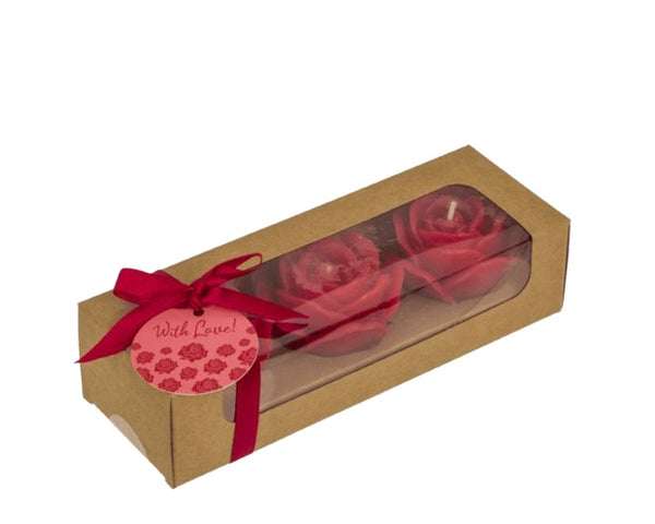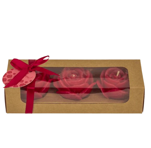Set aus 3 Kerzen in einer Geschenkbox in Form einer roten Rose.