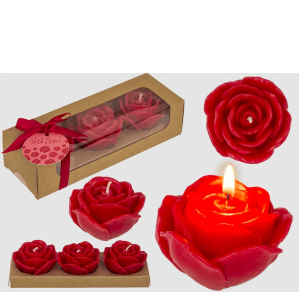 Set aus 3 roten Kerzen. Die rote Kerze in Form einer Rose symbolisiert leidenschaftliche Liebe und eignet sich perfekt für einen romantischen Valentinstag.